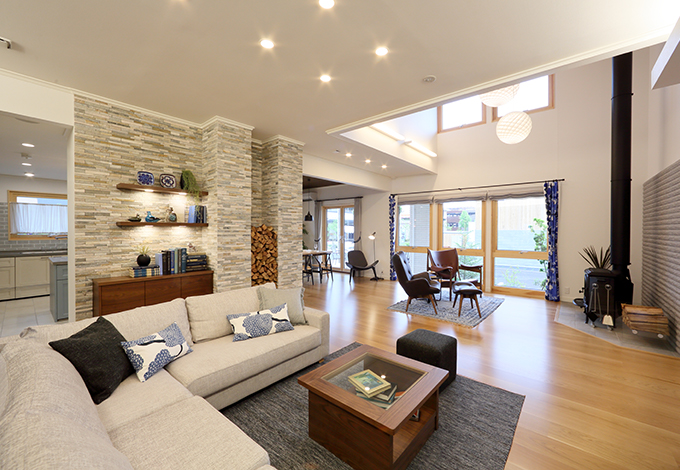 ナチュラルな空間の中に、自然の岩や石を思わせるタイルで薪ストックコーナーを演出し、ホテルのサロンのような落ち着いた空間を表現。ブルーグレーの北欧ファブリックをアクセントに。材質の異なるものを多用しながらも色のテイストを合わせることで、まとまりのある空間を表現できます。照明:louis poulsen