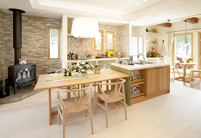 「趣味の家庭菜園と料理を楽しむ」をコンセプトに、グリーン色のキッチンと植物柄をモチーフにしたペンダントライトやカーテンを採用、タイルは土が感じられるような素材を選び、家具はナチュラルなオーク材のものにすることで、暖かみを演出しました。照明:louis poulsen
