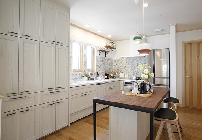 白を基調とし、キッチンの扉をホワイトとブルーで色遊び。海と太陽の光を思わせる照明器具で透明感を持たせました。アクセントとして、イエローなど鮮やかな色の小物を使うことで華やかさを添えました。照明:&TRADITION