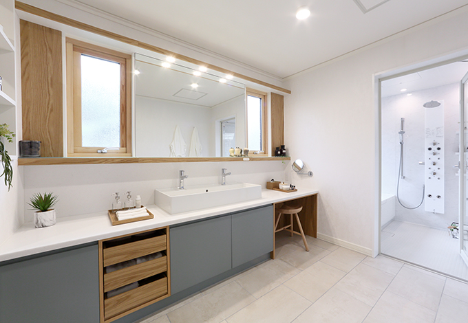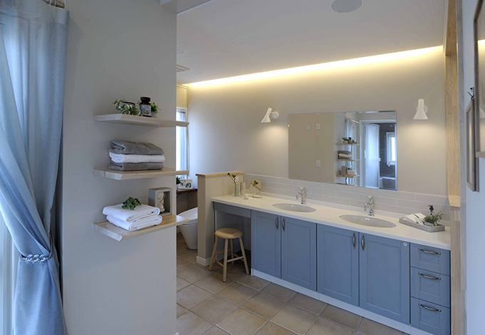柔らかな光を発する間接照明と優しい風合いの木製扉の洗面化粧台により、居心地のよいサニタリールームを実現。大型のミラー、2ボウルの洗面、角度の調整が可能な照明器具の採用により、使い勝手にもこだわりました。照明:louis poulsen