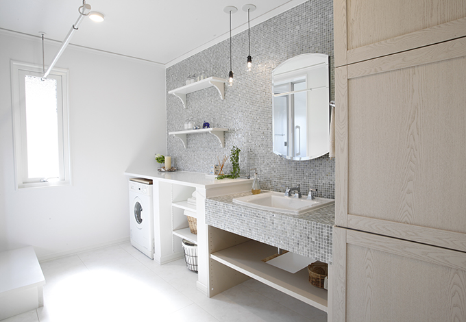 光沢ある繊細な色合いのガラスモザイクに、透明ガラスのペンダントとミラーを組み合わせ、清潔感とラグジュアリー感のあるサニタリールームに。ホワイトを基調にしたモザイクタイルにペンダントや間接照明を組み合わせると、ホテルライクなサニタリールームがつくれます。洗面ボウル:KOHLER