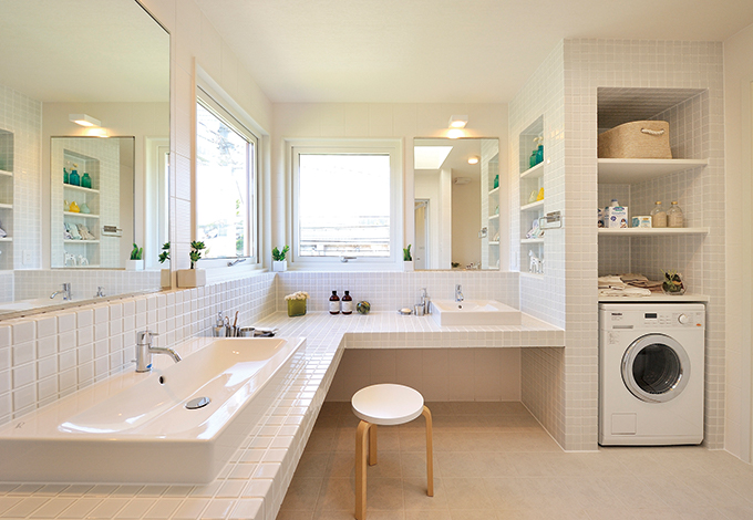 白を基調とした広いサニタリールーム。ブルーの扉がアクセントとなり清潔感・透明感のある空間を演出しました。洗面化粧台:CUCINA造作