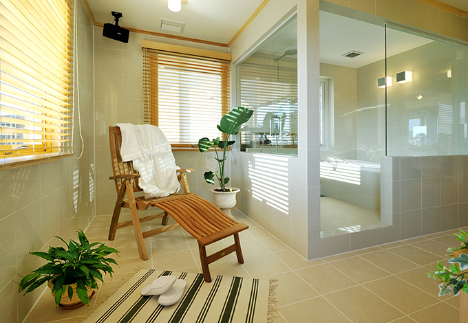 浴室とサニタリーには同じタイルを使用することで、広がりのある開放的な空間を演出しました。また大きな窓には、浴室専用の木製ブラインドを付けることにより、温かみのある雰囲気をつくりました。