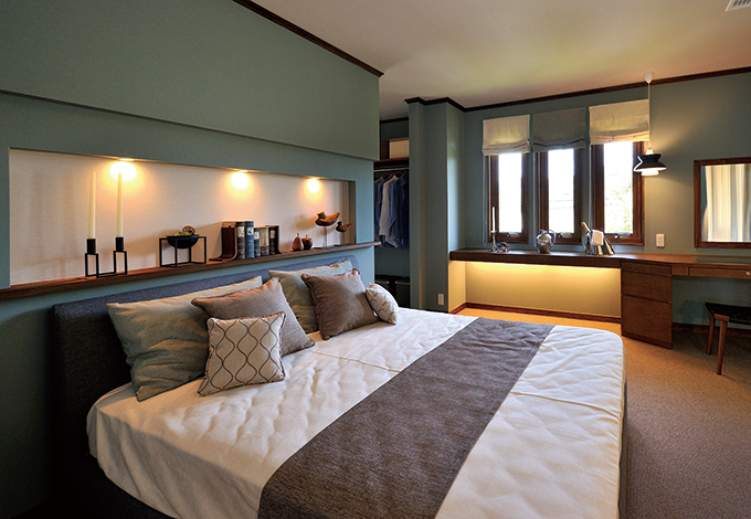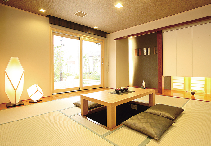 間接照明とスタンドの明かりでゆったりと寛げる空間を演出。壁に珪藻土を使用することで、光の反射がより柔らかく、優しくなります。