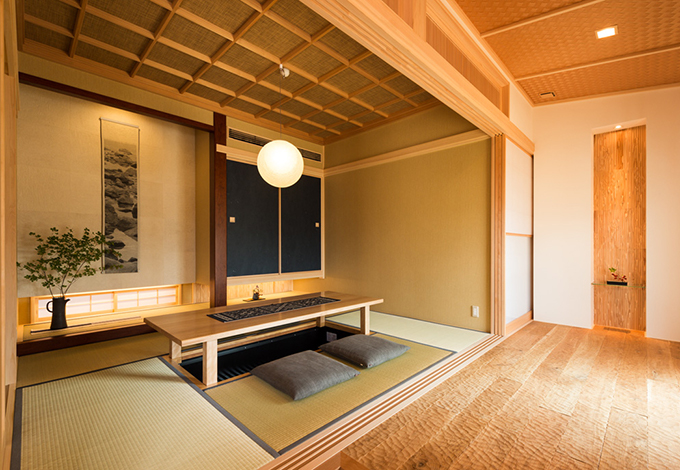 壁は自然素材の珪藻土で、白を基調に下部をベージュで塗分け、襖も同じような色合いで張り分けをして個性を演出しています。天井には「葭(よし)」という和室ならではの材料をあしらい、和モダンな雰囲気に。