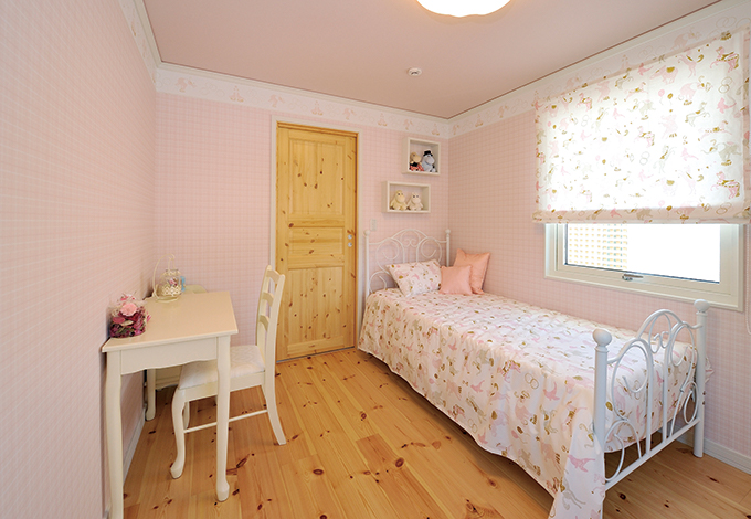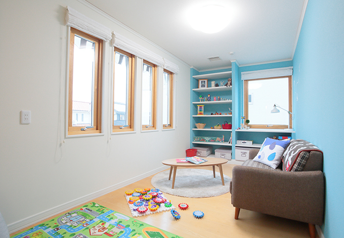 爽やかなブルーをアクセントクロスとして壁面に採用。青には集中力を増加させる心理効果があり、子供の勉強部屋には最適です。