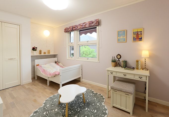 窓枠や巾木、廻り縁などの木部をすべて白で塗装し、壁には淡い水色のクロスを採用。明るく、爽やかなコーディネートに仕上げました。スウェーデン製の柄もののカーテンや、デスクにセットされたアントチェアで北欧らしさを演出しています。カーテン:Boras Cotton