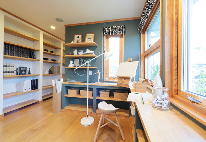 ホールの一部をご主人のアトリエに変更。壁の色を変えることにより別の空間であるよう演出しました。また造作の棚を増やすことで、使いやすさも考慮しました。
